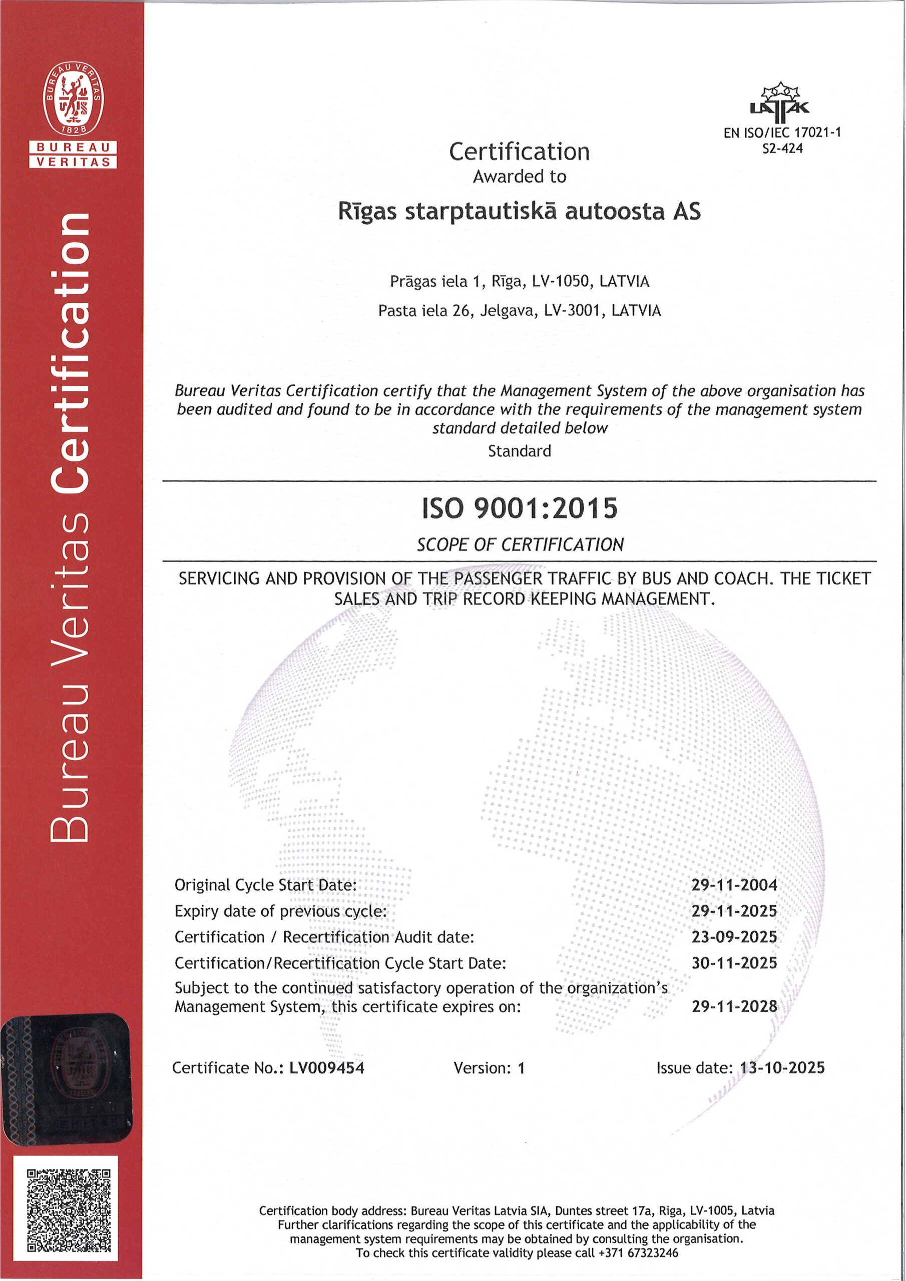 In the JSC Riga International Coach Terminal — a quality management system is established and certified —  in accordance with the requirements of ISO 9001:2015 standard. The scope of the quality management system is provisions of transport services for passengers, ticket sales, and coach run accounting management, which is the basis of the activities of JSC Riga International Coach Terminal.