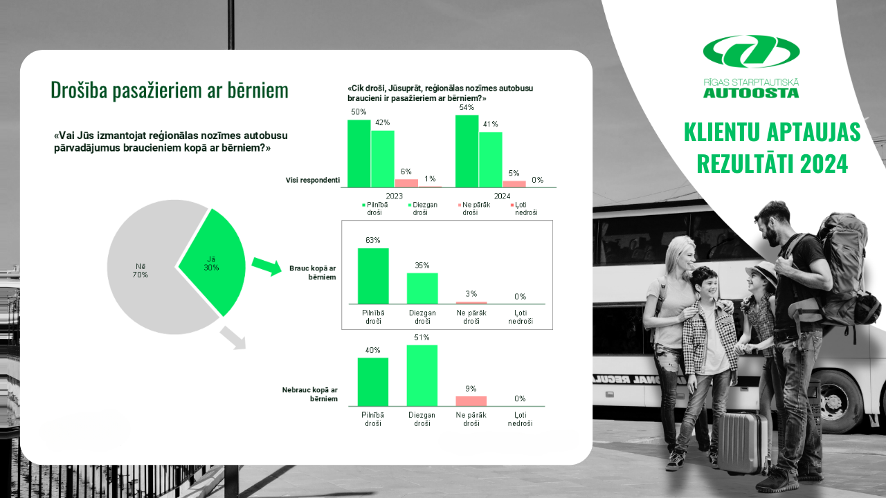 Salīdzinot ar 2023.gada aptaujas rezultātiem, par 7% ir pieaudzis to respondent skaits, kuri reģionālas nozīmes braucienos ar autobusu dodas kopā ar bērniem.